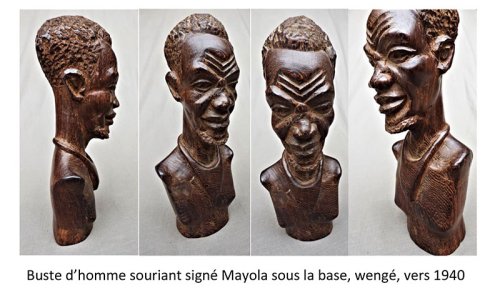 Enfin vient ce buste d’homme souriant, cet africain au sourire, dont l’expression contraste si fortement avec les visages fermés qui caractérisent les créations de tous les disciples de Mayola. Il doit s’agir d’un des tous premiers bustes en wengé, et on est encore loin de la maîtrise de ce bois très dur à tailler dont le sculpteur fera preuve un peu plus tard, à partir du milieu des années quarante. On est aussi très loin des dimensions spectaculaires des bustes en wengé que réaliseront bientôt ses neveux Massengo et Konongo. Le buste est un coup d’essai encore maladroit, les yeux ne sont pas très bien dessinés, les oreilles ne sont pas symétriques, même si on est face à un objet déjà beaucoup plus travaillé que ces têtes d’africains en ébène qu’on vendait aux blancs à l’époque.