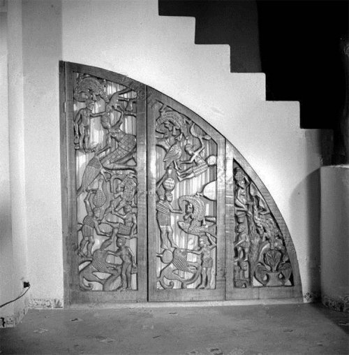Collectionneur d’art africain, Charles Lejeune cherchait un sculpteur capable de travailler parallèlement aux maçons et aux menuisiers pour faire de cette demeure une œuvre d’art unique. Il faut croire que les sculpteurs nombreux dans les cercles artisanaux indigènes de Léopoldville ne lui convenaient pas, trop influencés par l’art occidental. Lejeune cherchait un sculpteur traditionnel authentique, et on lui parla de Muta Mayola, qui devait déjà être très connu. A vrai dire Mayola était également influencé par ce qu’il avait pu voir de l’art occidental, mais moins formellement, les sculpteurs et autres artisans du Congo Brazzaville n’ayant aucun encadrement comparable avec ce qui était en place côté belge. Et avant tout, Mayola était un sculpteur traditionnel téké. C’est ainsi que l’assureur désireux d’en avoir le cœur net fit la traversée du fleuve jusqu’au village de Kingoma, où il recruta toute la famille Mayola – Papa Mayola et ses fils Maurice et Célestin. Mayola avait dû montrer à Lejeune ce qu’il voulait voir.