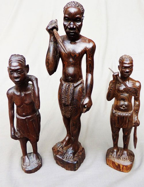 Celle qui est probablement la plus ancienne est une statuette d’un style naturaliste. Elle doit dater des années 1930. Haute d’une trentaine de centimètres, en bois de wengé marron foncé, elle représente un homme vêtu d’un pagne traditionnel le bras gauche replié sur l’épaule comme s’il portait une charge. Peut-être un chasseur de retour de la brousse. La tête est disproportionnée par rapport au corps. Le personnage est un petit homme du commun. On imagine que Mayola a dû produire un certain nombre de ces figurines, dont le style et les dimensions ont été repris par énormément de sculpteurs africains.