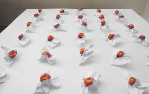 C’est pourquoi il est impossible aussi de ne pas esquisser un sourire devant ces pommes ou ces concombres à la fois nets et plissés. En effet, la distance introduite par ce double geste entre image et objet, fait jaillir la source de l’ironie et fait passer sur le regard le sillage d’un sourire amusé.