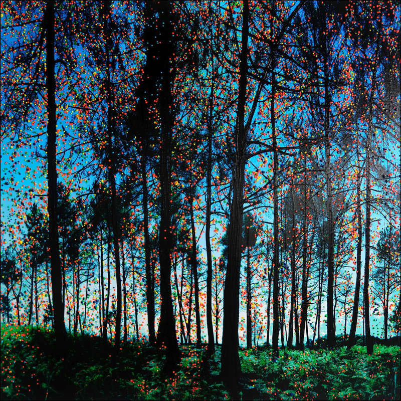 Ces points colorés évoquent à la fois la multitude des pixels de la photographie d’origine ainsi que les particules et corpuscules qui, à chaque instant, nous traversent et rappellent certains aspects de la physique quantique, notamment les concepts d’intrication reliant des particules à distance.