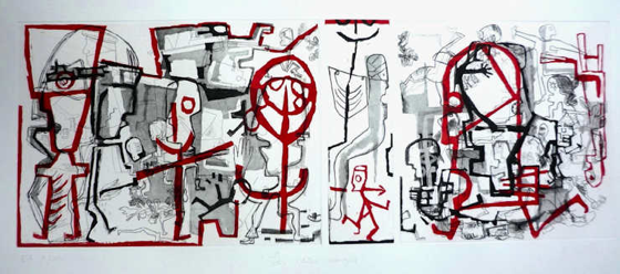 Et puis il y a ces ruptures de taille dans les éléments représentés. Ici, une main immense semble passer comme un pardon sur un monde dangereux. Là, un pied semble tâter l’eau pour savoir s’il peut se baigner. Mais il est sans propriétaire. Est-ce nous, les spectateurs, qui devons nous identifier à ces formes-là ? Il se pourrait plutôt que nous dussions nous chercher au milieu de ces corps embarqués dans le grand voyage de la vie. Mais grand ou petit qu’importe. Chacun de ceux qui errent dans ces dessins est l’un de nous, ou plutôt chacun de nous est l’un d’eux.