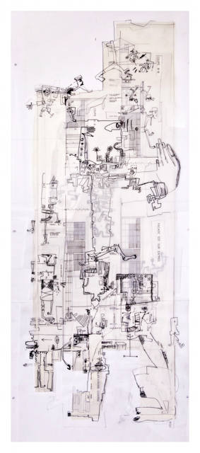 Ce qu’elle a mis en place de radicalement nouveau ces dernières années, c’est un travail sur papier-calque qui donne à ses œuvres une ampleur inédite. Là, le plus souvent, pas de couleur, mais un réseau de lignes d’épaisseurs variées, d’encres différentes, signalant des fonctions diverses : former un visage, indiquer une direction, engendrer une fleur, découper une main, recouvrir un souvenir, dessiner un fragment de carte, extirper un détail de la mémoire, en noyer un autre dans une tache sombre, soulever un bras articulé, contraindre une force à se tenir tranquille, saturer l’espace, connecter une arme à un bout d’espoir, ouvrir une route, faire basculer une montagne, ensevelir la douleur.