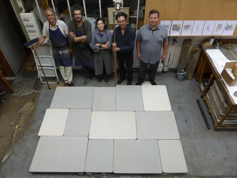Aucune pierre lithographique et aucune machine au monde ne pouvant offrir la possibilité de réaliser une lithographie de cette taille, il fallait donc que le travail passe non seulement par les étapes habituelles, mais par une élaboration aussi minutieuse que complexe, d’un assemblage de feuilles réalisées à des moments différents et qui devaient cependant parvenir à s’agencer de manière telle qu’une œuvre en soit le résultat.
