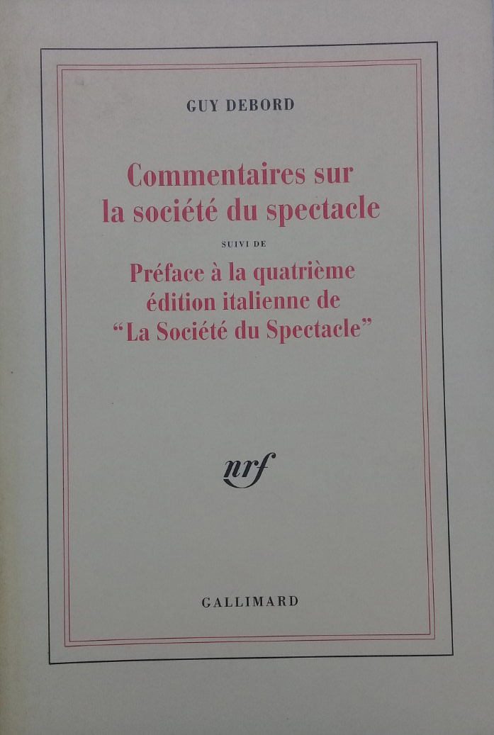 Le livre intitulé Commentaires sur la société du spectacle paru en 1988 aux éditions Gérard Lebovici peut être considéré comme l’une des rares tentatives de faire non seulement le portrait d’une époque mais de montrer en quoi et comment elle a changé en l’espace d’à peine vingt ou trente ans. Et si Debord peut le faire c’est bien sûr parce qu’il a écrit en 67 La société du spectacle.