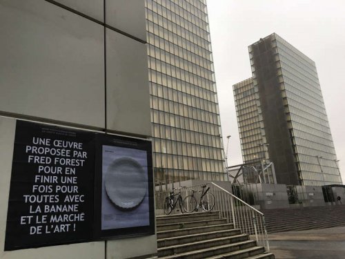 Conformément à sa pratique connue, Fred Forest s’est emparé de cet espace pour élaborer une œuvre critique à partir d’un fait récent dans l’actualité. Celui de la vente d’une banane par la galerie Perrotin, maintenue accolée sur la cimaise par un double scotch gris. Cette vente a constitué un véritable événement social, médiatique, économique, mondial, et si l’on veut bien également artistique... Pour un montant de 120.000 $ usd lors d’Art Basel Miami 2019 une collectionneuse Française qui passait par là et amie du galeriste a enlevé prestement le lot.