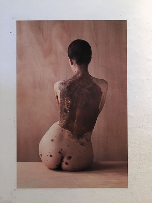 La notion de peau sur laquelle des formes, des textures et des couleurs laissent apparaître un espace cartographié se découvre dans les portraits d’Isabelle Chapuis. Ses deux photos, issues d’une série (toujours en cours), intitulée Éloge du vivant, témoignent des façons dont le corps humain est considéré selon les cultures. Si la relation à la cartographie ne se lit pas de prime abord, on peut saisir dans ses images, un témoignage de l’identité culturelle de territoire. Pour l’artiste, en effet, la peau est « comme l’expression extérieure d’une cartographie émotionnelle intérieure. Elle est frontière, lisière, zone de rencontre et de contact avec l’extérieur [4]. » Ces photographies proposent, comme des cartes, un signe pour évoquer un territoire. Elles révèlent de quelle manière l’homme est marqué par les territoires qu’il habite et traverse.