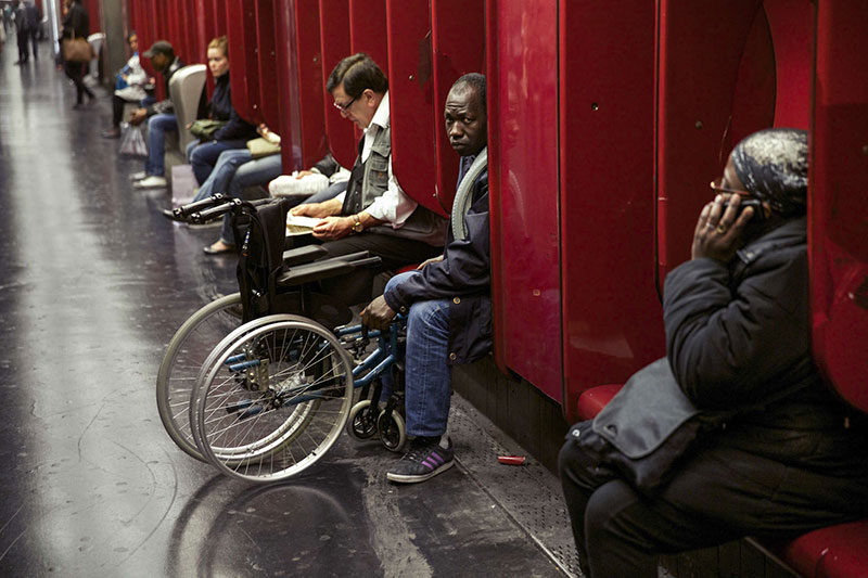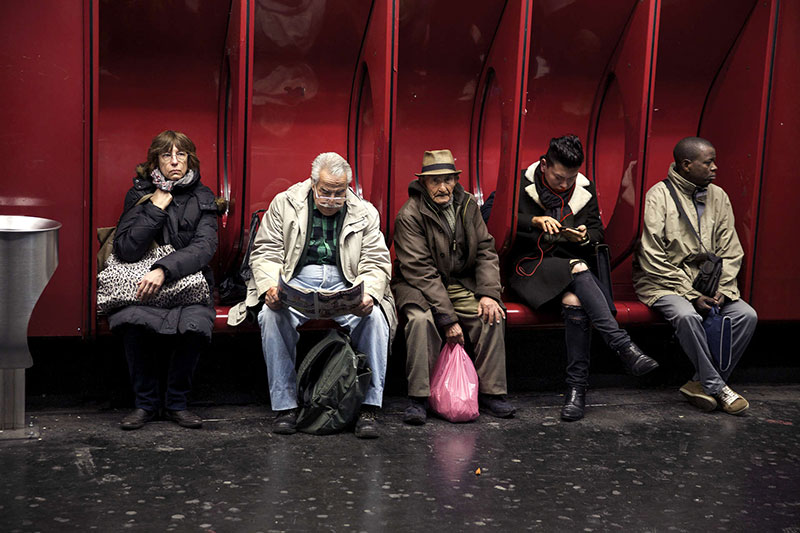 Alain Nahum est passé par la nation, entendons la station de RER, régulièrement pendant des mois et son œil attentif n’a pu s’empêcher de trouver dans cet endroit un motif. C’est bien sûr le fond rouge de ce mur de plastique brillant qui est en fait une sorte d’ensemble de cases abritant des siège d’une largeur qui ne semble guère répondre à la taille du corps humain qui vu de l’autre côté des rails lui a paru remarquable.