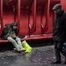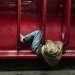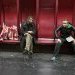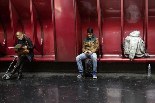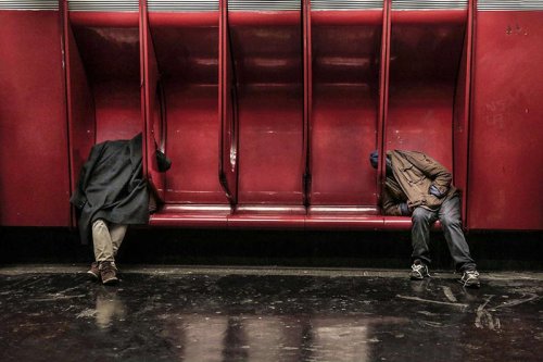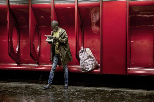 Ici rien que des gens qui prennent le RER comme moyen de transport et donc attendent. Mais parmi eux, il y a ceux qui prennent le RER comme abri voire comme habitat fut-il temporaire. Ce sont ceux là, hommes précaires aux allures d’épouvantails n’effrayant aucun oiseau, qui donnent le ton de ce qui a lieu dans ce non-lieu : une métamorphose. En effet, ici on attend et l’attente est, on le sait, le nom de la foi pour ceux qui errent dans le tourniquet des jours. Que ce soit le train ou la révélation l’objet de l’attente est à la fois le supporte de la foi et sa négation. Car quand cela arrive, il faut redevenir ce que l’on avait oublié être : un homme. Entre temps, pendant ce temps nu de l’attente, on est autre chose car porté au loin par l’attente même. On devient, ainsi posé devant ou dans ces cases rouge bordeaux, assis ou couché debout ou en train de marcher le long du quai, rien d’autre qu’un fantôme.