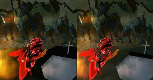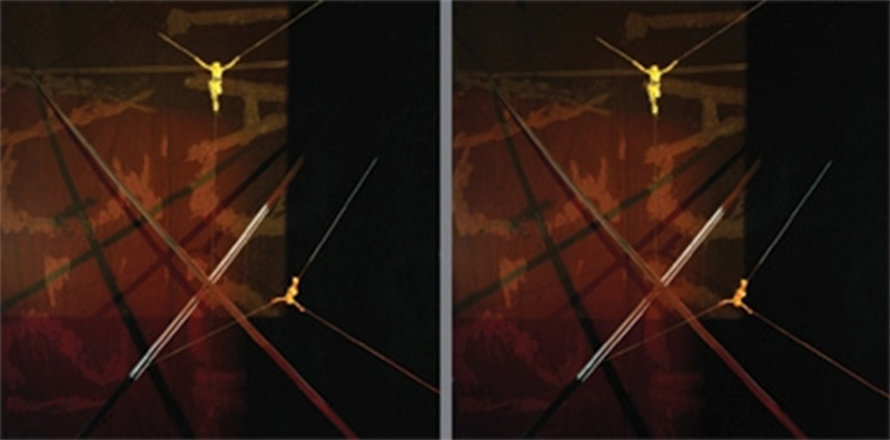 Mais le troisième terme redimensionnant des lunettes magenta/cyan ne restaure-t-il pas le caractère autoritaire du triptyque, cet « autel d’un art-religion adventiste » devenu créateur, source de sens, le panneau médian, la double image originaire des panneaux latéraux levée dans son surgissement par l’anaglyphe en un [17] ? Pourtant, c’est ici que se rompt cet art devenu par trop réel. L’histoire des « rapports immersifs de plus en plus intenses » de l’œuvre d’art contemporaine évoquée par Peter Sloterdijk lors du colloque de Karlsruhe sur la « 3D et le cinéma » se rapproche toujours davantage de la scène-lucarne, Guckkasten du théâtre [18]. Une constante plongée dans l’ « instemps », Jetztzeit, a lieu, provoquant le retrait du temps, le basculement du sol [19].