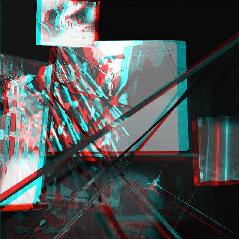 Dans Fuite, Tempête de feu sur Dresde le rapport de la figure et du fond s’estompe. De multiples métaphores de ruines tournant à vide s’enchevêtrent en relief sacral – Ekkehart Rautenstrauch ayant lu dans les « ruines » de notre lettre du 9 septembre 2010 des « runes » gravées sur son nom, Rautenstrauch, buisson de rues – entre le fond résiduel sombre et la figure jadis resplendissante. Le magenta et le cyan de la sédimentation des couleurs stéréoscopiques, qui pour le pianiste virtuose Rautenstrauch signifie aussi composition de couleurs sonores, se dédoublent à l’infini. En haut à gauche dans le carré s’élonge, s’étonne, souffre la créature dans le théâtre de guerre. Tout à fait à droite s’esquisse un pur carré cyan-magenta en guise de partition visuelle dont le programme de lumière double vectorise le tout, sous-pixellise ce tableau achiro-poiétique (Marie-José Mondzain). Dans le stéréo-diptyque où crissent le vert et le rouge viendrait se décorporéiser le triptyque monochrome d’Alexander Rodtchenko (1921), Pure couleur rouge ; pure couleur jaune ; pure couleur bleue, dans lequel le Trois exprime « le caractère originel de la forme, de la connaissance de soi et de la perception d’autrui [8] ». Rautenstrauch construit ici en arc-boutement l’image sonore bi-chromatique, où le contraste du magenta et du cyan, « peut-être kitsch » nous écrivait-il, porte l’absurde courbe électronique que trace son logiciel à travers la tempête de feu de Dresde, tels « les cris perpétuels des humains » dans l’Enfer de Dante [9]. Le 10 février 1995, le journaliste Christoph Dieckmann évoqua cet anéantissement de Dresde les 13 et 14 février 1945, le jour des treize ans d’Alexander Kluge qui endura celui de Halberstadt près de deux mois plus tard : « Oh ! Les ruines étaient des paysages, comme sont des arbres [10]. »