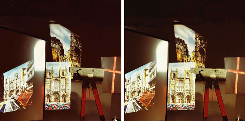 Loin de l’efflorescence du triptyque telle qu’elle fut célébrée à Stuttgart lors de l’exposition de 2009, Rautenstrauch expérimentait en promeneur méditatif ses anaglyphes et ses stéréoscopies au bord de la Loire vers Notre-Dame de Lumières. Quelque intime, à l’instar de la différence des deux images que le regard non-cataracté confond, soit leur juxtaposition, elles n’en demeurent pas moins à même le diptyque et sa dualité. Wolfgang Ullrich a montré combien ce diptyque relève l’effet de l’image solitaire, combien la seconde image relativise la première, de sorte que le regardeur sonde la différence posée par les deux images dont la jointure, cette tierce image invisible, devient alors décisive [15] : le triptyque de l’espace mental qu’invente le regardeur, une synthèse de Goethe et de Newton ? Pour Rautenstrauch, le Guckkästner, ce pérégrin d’images à la boîte optique légère qu’on appelait jadis « savoyard », l’image stéréoscopique, c’est « une construction impalpable, qui ouvre un espace visuel, imaginaire, mental et pourtant tactile » (« Petite introduction », 12 septembre 2010). Sa boîte optique, qui fut un « media mobile de masse », devient lanterne magique inversée, à l’image de laquelle vient le regardeur, au lieu que l’image vienne à lui [16].