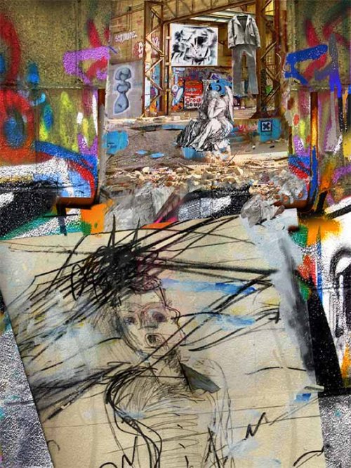 À l’instar de Werner Herzog dans La grotte des rêves perdus, Ekkehart Rautenstrauch confirme dans Melencolia Brachland Variation I l’affinité « au goût de prédestination, entre le relief optique […] et le relief physique des aspérités », par peintures numériques aux piliers métalliques « revenants » des halles de l’ancienne fonderie de l’île de Nantes. Rautenstrauch réverbère derechef cette friche industrielle sur débris et graffittis par évent stéréométrique surgi du minéral et du numéral dans cette halle de 115 mètres de longueur et 16 mètres de hauteur, jadis équipée d’un four à réverbère destiné à la fabrication d’hélices de bateau en alliage de cuivre et aluminium, cet espace généré par toutes stéréométries de révolution, transformé après dissémination en la « troisième nature » d’un « jardin exotique » sur l’île de Nantes. Sur Melencolia Brachland Variation I (automne 2011), la créature de Dürer tourne le dos à la scène aux pixels tels des pinceaux hyperpicturaux lovés dans l’ « espace de transit » (Veronika Mertens) en déshérence. Contre son accès corrosif met en garde dans un carré bleu clair une croix de Saint-André bleu foncé, la decusata [26]. Suspendu en hauteur à la croix d’un cintre, rien que le célèbre costume en feutre de Josef Beuys. Ce feutre à la structure interne non pas ordonnée mais chaotique, en états d’agrégats modifiés, incarnait pour Beuys à la fois le chaos et la chaleur, aux antipodes de la pierre et du cristal immuables, transis par l’acedia, l’indolence en quelque sorte baroque d’un cœur aussi glacial selon Dante que « la morsure d’un chien enragé [27] ». À l’encontre de l’image, ce « tissage de temps », le gris de l’anti-tissu « feutre » suscite selon Beuys les couleurs de l’arc-en-ciel. Dans « Brachland I », ses couleurs éclatées, éclaboussées de bleu déclosent de bas-fonds mélancoliques en ruine. Devant Mélencolia cernée de bleu, assise au bord d’une béance semblablement bordée de bleu, entre deux allées brunes jonchées de pavés presque cubiques, gît en fragmentations cristallines le polyèdre de Dürer si soigneusement taillé jadis, aux deux sommets tronqués, que Zwei Steine, un stéréogramme de la Fabrique d’art de Rautenstrauch, a monté ailleurs en un exact diptyque avec pavés déposés au premier plan. Ainsi le Bildkästner contemporain, monteur, montreur de précises images stéréoscopiques, vivifie l’antique lapicida, ce tailleur de pierres stéréométrique qu’évoquait le rhombe de Dürer [28]. Mais de tout en-bas, interpellant le premier plan, de face, une figure dessinée, peinte à la main sur une feuille plusieurs fois gondolée est happée selon les vieilles lois de la perspective. Sous les ratures et rayures aléatoires noires adoucies par des taches et traînées bleues déborde cette créature nue étendue de face. Le triple orifice d’une bouche et de deux yeux presque carrés s’écartèlent sous la patibulata, s’agrandissent sous l’avertissement de la croix à l’horreur infligée par une main déclose, à l’autonomie chiro-poïétique d’un pinceau au-delà, en-deçà de toute stéréoscopie –