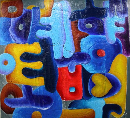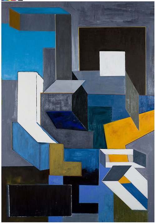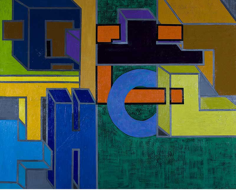 Certaines toiles sont composées de lignes géométriques de couleurs vives. L’image est à la fois lettre et objet, signe et représentation d’une chaise ou d’une table. Nous sommes au point de jonction entre art et design, entre signe et forme. Dans d’autres œuvres faites de petits carrés de couleur sont strictement géométriques. La ligne et la lettre se mêlent pour faire émerger une forme abstraite et concrète à la fois. On est, ici, au cœur de ce courant artistique que l’on nomme art abstrait.