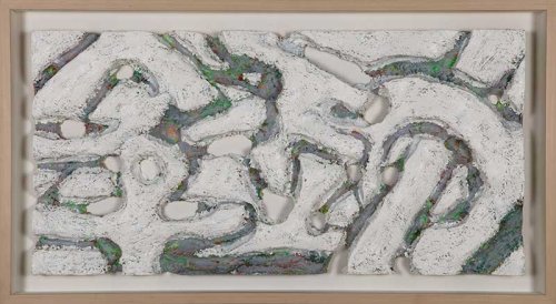 Certaines de ces toiles sont à rapprocher d’œuvres de Paul Klee mais aussi des grands N’tschak des peuples Kuba, en Afrique, par exemple. Dans ces œuvres des éléments plastiques, des lettres ou des signes, dessinent littéralement des paysages et mettent en scène le mouvement de la pensée.