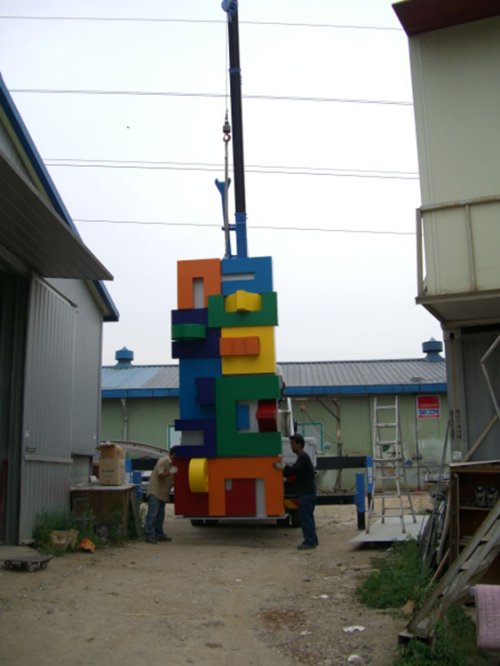 En Corée cependant, les lettres recèlent des possibilités architectoniques importantes. De grandes toiles semblent des fenêtres ouvrant sur des mondes chargés et chaotiques. Elles démontrent avec clarté combien peindre et construire sont un seul et même acte. La sculpture composée de lettres de couleur vive en métal, construite comme un empilement de lettres en est l’un des meilleurs exemples.