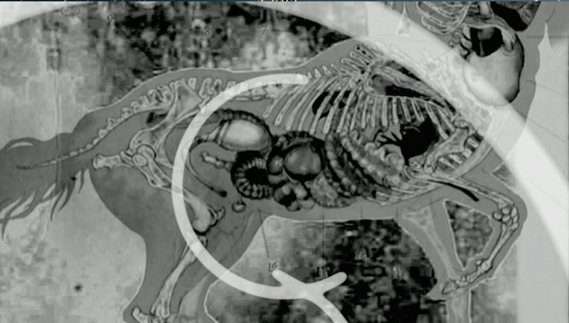 Ils portent l’estomac dans leur corps chevalin. Car les chevaux sont des animaux prompts à fuir : estomacs et intestins fugitifs. Ainsi le thorax humain et le milieu du corps sont-ils disponibles pour le souffle. Mais les deux corps peuplés de colonies d’esprit et de nerfs comme d’une flore intestinale. Une cohésion précaire. D’où l’ivrognerie et l’addiction aux drogues, pour que le cerveau „joue“ dans ses colonies. À l’emplacement du diaphragme chez les humains se trouve chez Chiron l’estomac aux drogues. Là où se situe le cœur des chevaux au galop, se trouve chez le centaure le MAELSTRÖM DES SUBSISTANCES MATÉRIELLES. Or la racine d’immortalité de Chiron réside dans cette partie inférieure du corps. De ce point de vue, les organes d’un centaure ne sont pas comparables à un convoi ferroviaire composé par exemple d’une locomotive tirant des wagons sur des rails fixes, bien au contraire : ils constituent une unité aterrestre. J’appellerais volontiers le corps chevalin et l’esprit pérégrin du centaure son soleil. L’aire sexuelle contiguë à l’appareil digestif caché à l’intérieur du cheval, je l’appellerai lune. Télépathie à travers toutes les fibres de cet être perpétuellement excité et de ce régime néanmoins tranquille régnant dans le chef de Chiron. Ce que souligne déjà Hérodote. Les centaures n’ont pas d’anus et ne connaissent pas d’excrétions. La chose digérée s’exhale à travers la peau et le poil. À supposer qu’une parcelle de ce qu’ils ingèrent comme matière (et pas seulement le contenu de leurs outres) conserve quelque choséité, puisque les centaures plutôt complexes, tel Chiron, ne connaissent (selon Plotin) aucun dualisme entre esprit et matière. TOUT EST SPIRITUEL. D’où la difficulté pour l’anatomiste, comme le remarque déjà Avicenne, d’appréhender l’essentiel lorsqu’on découpe le corps d’un centaure mort.