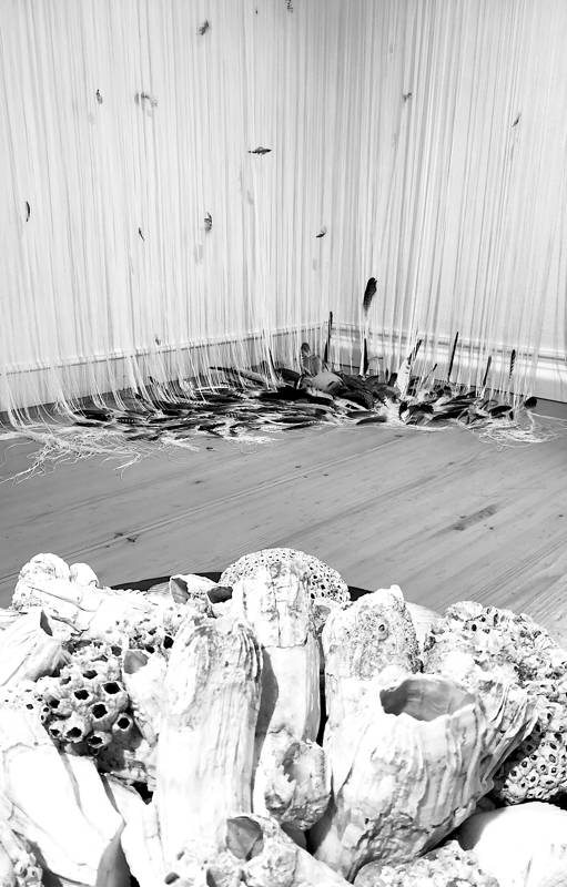 Nelle istallazioni, che appaiono di declinazione ‘rituali’, si mostra proprio questo analogon tra scrittura a-semantica e materie della terra – pietre, foglie, fiori, piume – composte come ‘alfabeto’ dell’innominabile, dove scrittura e materia incrociano un inno al “dio sconosciuto”, o, forse, al dio assente. Nella camera materico-grafica lo spazio delle forme vìola l’ordine percettivo ambientale, lancia nuove traiettorie dello sguardo, sospende i segni in prospettive estreme, in impossibili possibilità, in ascensioni e cadute di fugaci logos e symbolon.