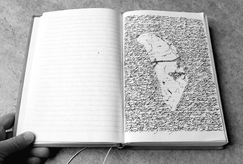 Ed è nelle pagine del libro che il ‘racconto’ segnico si fa nella sua piena evidenza visuale. L’artista scrive una storia ‘senza senso’, senza inizio e senza fine, con nuclei pre-alfabetici che sembrano spoglie di cosmogonie o cartografie di un naufragio del linguaggio. Sono ‘report’ di un sospeso addio al Senso : apocalissi della scrittura che riflette la sua caduta ? La domanda resta aperta, quanto inattualmente contemporanea, sulla soglia tragica del tempo dell’arte come tempo del dis-senso.