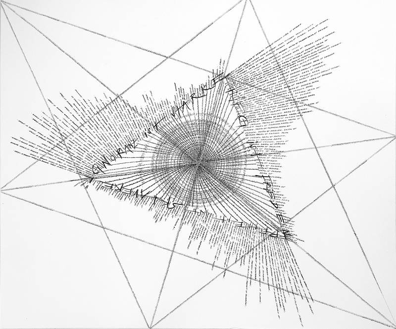 Non cancellazioni, non oscuramenti dell’opera della conoscenza, di riflesse filosofie ri-segnate nelle volute spiraloidi di orbite spaziali o di coordinate cosmografiche, ma il trasparire del rammemorante oblìo risonante nella ‘parola sensata’ che lo fa rifrangere sismograficamente nelle onde e negli slittamenti nel contro-senso della scriptura. La ‘scientia’ del Logos – Platone, Kant, Holderlin, Fichte, Leonardo – viene tra(n)scritta e ‘orlata’ da una calligrafia degli enigmi e del mistero del segno s-definito, vuoto di Senso ma con la tonalità desiderante di sentimento dell’inconoscibile che abita le regioni del senso. Così è, di Julia Rhizoma – nell’opera di costellazioni e addensamenti di eterodosse geometrie e di corpi segnici liberati in un tempo spaziato – un tra-dire la parola che apre a dimensioni reticolari del ‘sentire vedendo’, in flussi ed espansioni che nel vuoto depongono un originante inno all’invisibile.