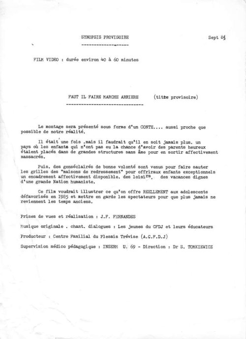 Bien après, pendant le mois d’août 1985, Joe Finder convie Jean-Francis Fernandès à venir tourner un film pendant les vacances des jeunes du foyer du Plessis-Trévise dont il s’occupe alors. On est à Brignolles, dans un ancien centre d’apprentissage du Ministère de la Justice. Dans cette architecture contraignante, il va découper des panneaux de ciel clair et conférer à la vie de ces jeunes une réalité qui enveloppe la fiction d’une lueur réelle d’espoir.