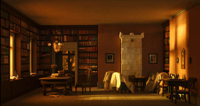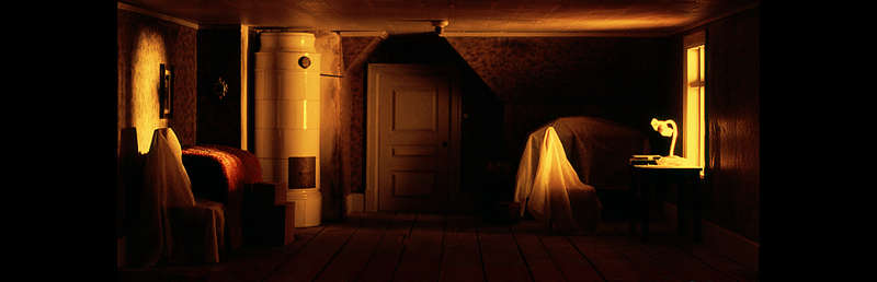 De nombreux indices corroborent cette hypothèse, et en particulier un ensemble de détails qui « prouvent » que la maison, pour abandonnée ou vide qu’elle soit, n’en est pas moins habitée ou hantée : des verres sur la table, un jeu d’échec sur le guéridon, un livre sur le bureau, des casseroles sur le poêle. La maison ne cesse pas d’exister lorsque nous n’y sommes pas. D’autres semblent y vivre ou du moins y passer. Mais qui sont-ils ? Des êtres vivants ? Ayant des corps ? Si c’est le cas, ils sont absents car on ne voit aucun corps. Seulement des draps recouvrant des sièges mais qui leur confère en effet une véritable allure de fantôme. Oui, ce que nous montrent ces images de Magnus Petersson, c’est un monde habité par des fantômes, hanté par des fantômes, un monde fantomatique dans lequel ce que l’on cherche à apercevoir, ce sont des fantômes.