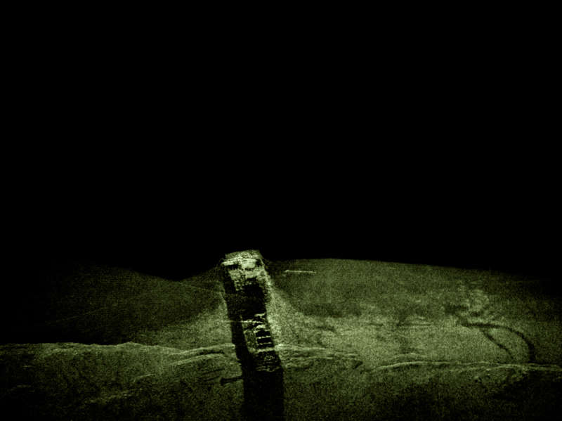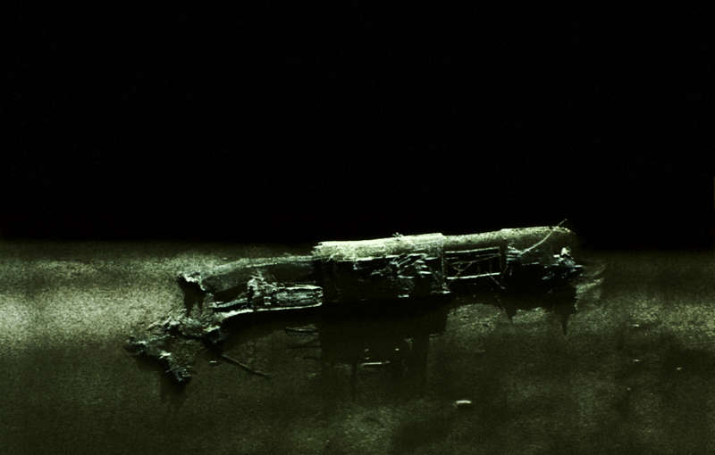 A side-scan sonar is a marine technological instrument that scans the seabed using diagonal sound waves that are being transformed into an image in the computer. An objective gaze is directed down towards something the human eye cannot see and it is registering a world beyond the accessible. Ships that never reached their destination suddenly emerges on then screen, time capsules that have been left to the slowly progressing decay of the depths are again becoming visible. The sound waves that are reaching down through the dark waters are returning back with echoes of an apocalyptic story.
