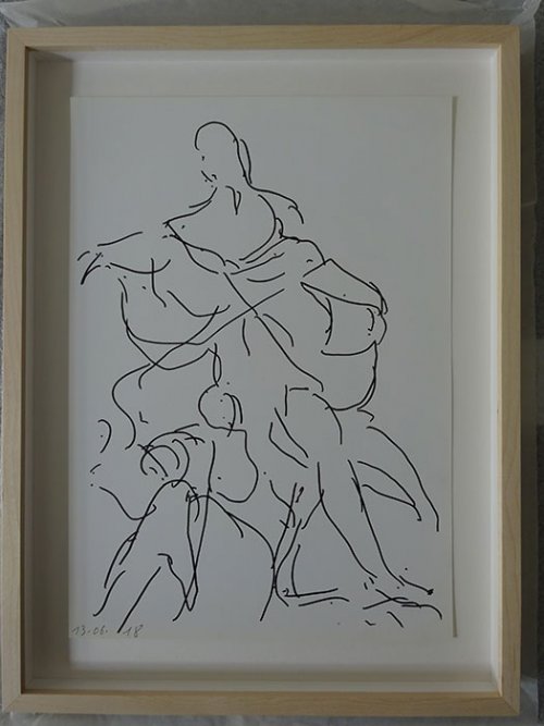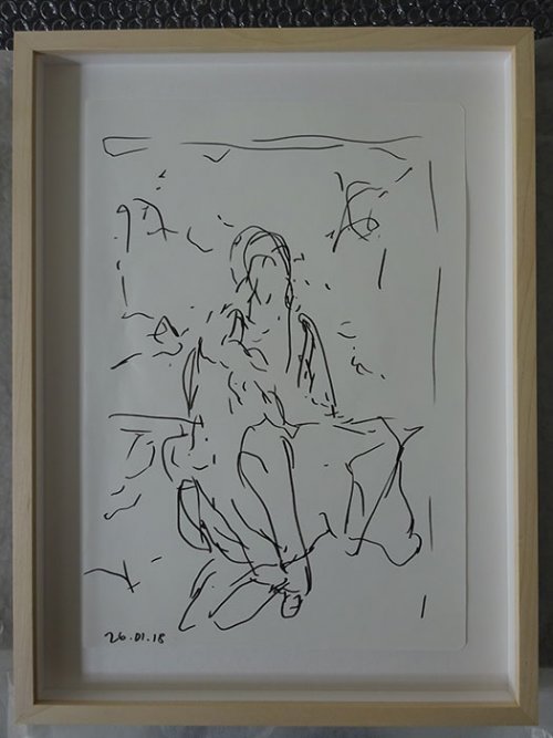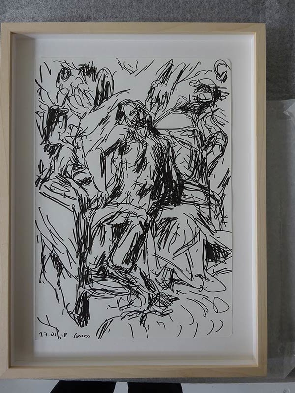 Pour ce qui est des dessins, qui sont une partie pas encore exposée de son travail, elle les réalise davantage en dehors de son atelier, que ce soit d’après les plantes du jardin ou devant les tableaux du musée. Les dessins présentés ici ont été faits au Prado à Madrid. Elle dessine sans regarder son papier, d’où les points sur la feuille, qui marquent les pauses du feutre ou de la plume pendant que son regard se déplace.