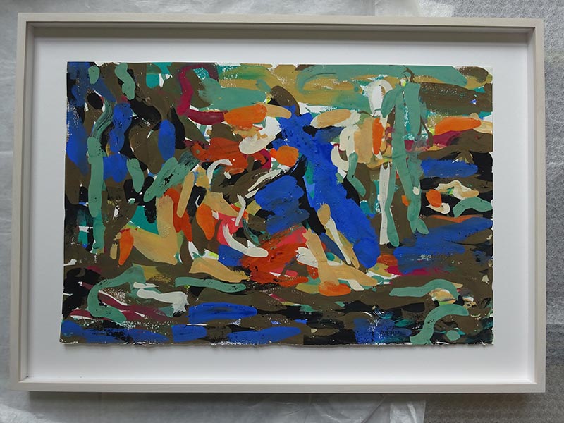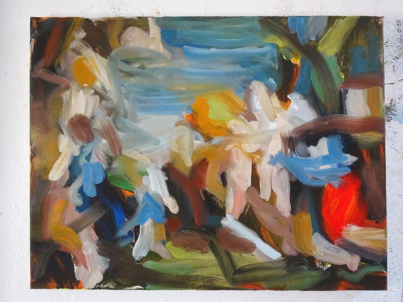Puis commence le travail de peinture : pour se libérer du sujet du tableau, elle n’hésite pas à retourner le catalogue, ou encore à plisser les yeux, afin d’altérer une perception trop évidente.