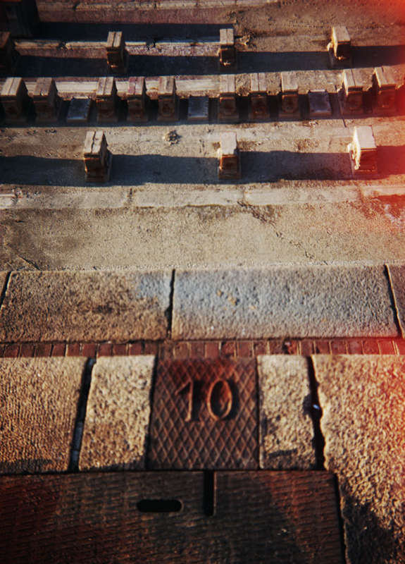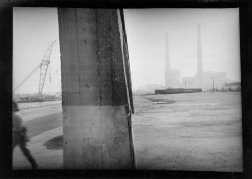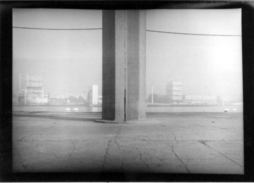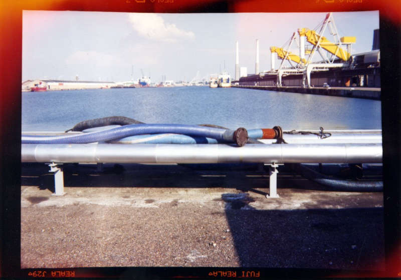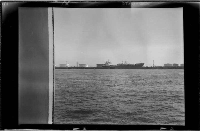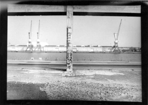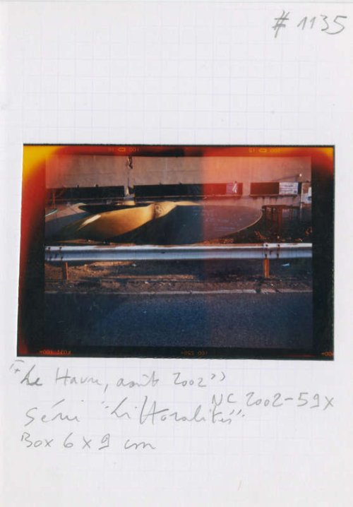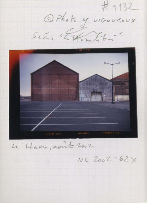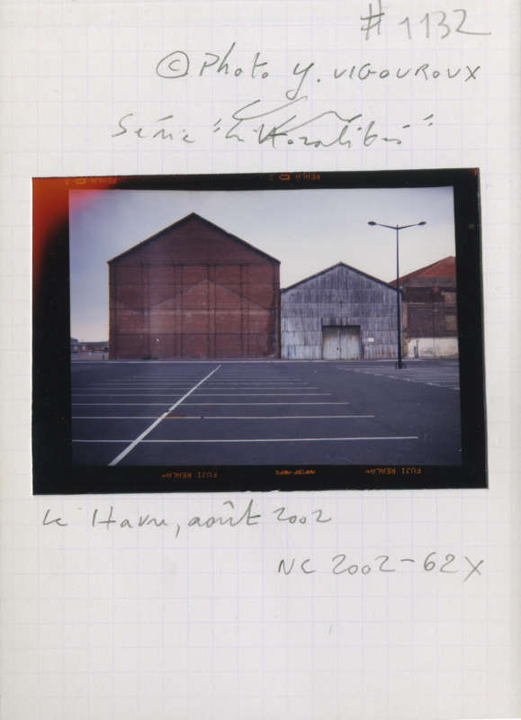 En effet, le vignettage des images et le tirage laissant apparaître les marges noires viennent paradoxalement renforcer la richesse plastique qui règle la composition de chacune des photographies du Havre, et leur confèrent une surprenante dynamique. Inscrites, d’une part dans un maillage de lignes de forces et de tensions, qui entraîne le regard à sa circulation, ses images sont, d’autre part, animées d’un jeu chromatique qui en souligne la mise en scène. Il en résulte une sorte de vue prospective qui questionne la perception segmentée et télescopée que nous avons des paysages urbains et industriels.