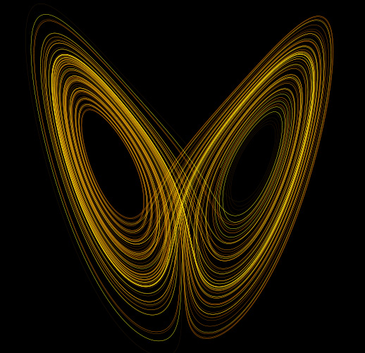 Au-delà du temps caractéristique, on ne peut plus rien calculer car les écarts s’amplifient de façon exponentielle, jusqu’à un certain point quand même car ça va vite et on sortirait aisément des limites de l’Univers, comme le fait remarquer le mathématicien ami du Maître en modernité. À chaque simulation, le phénomène se traduit par une trajectoire dans l’espace et comme il y a toujours un écart, même infime, dans les conditions initiales, les trajectoires diffèrent plus ou moins avec cette amplification plus que rapide. Au-delà du temps caractéristique, le système, ou plutôt le produit de la simulation, enfin la trajectoire, va retomber dans certains parages, que l’on appelle « attracteurs étranges », et y rester, et toutes les trajectoires des phénomènes issus des différentes simulations vont se retrouver par là comme si elles étaient attirées... étrangement. Tout cela nous donne une très jolie image en forme de papillon et de fait l’attracteur étrange devient « l’attracteur du papillon ».