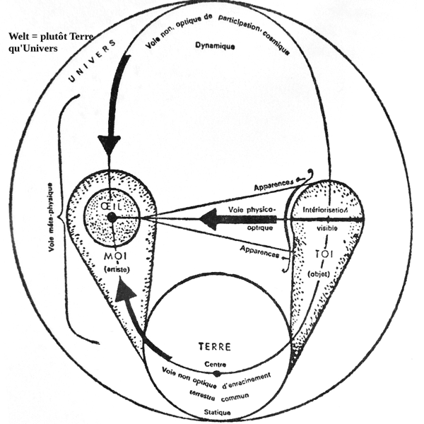 « Premièrement, la voie d’un commun enracinement terrestre qui, d’en bas gagne l’œil. Deuxièmement, la voie d’une commune participation cosmique qui survient d’en haut. [..] Sur la voie d’en bas soumise à la gravitation terrestre résident les problèmes de l’équilibre statique, dont la devise pourrait être „rester debout envers et contre toutes les occasions de tomber“ . Aux voies d’en haut conduit l’aspiration à s’affranchir des liens terrestres pour atteindre, par delà la nage et le vol, à l’essor libre, à la libre mobilité. »