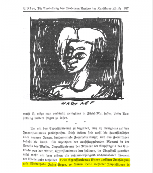 En 1912, dans la revue suisse Die Alpen, Paul Klee publiait un compte-rendu de l’exposition d’art moderne qui s’était tenue à Zürich sous le titre : Die Ausstellung des Modernen Bundes im Kunsthaus Zürich. Dans cet essai, paru en français sous le titre Approches de l’art moderne, il marquait la différence entre l’impressionnisme et l’expressionnisme conçu comme « construction active de la forme ». Il préférera plus tard le terme de « composition » au sens musical à celui de construction. Il aborde aussi la question de la latence entre « réception et restitution productive » d’une œuvre d’art. Dimension reprise par Bernard Stiegler pour inscrire des temporalités dans le circuit noétique qui est toujours social. Reprenant la distinction aristotélicienne entre âme végétale, âme sensitive et âme noétique, le philosophe écrit :