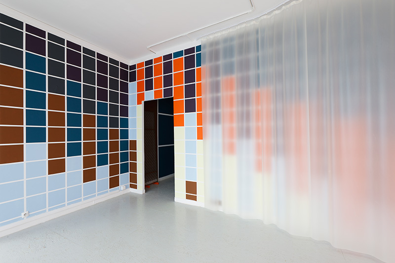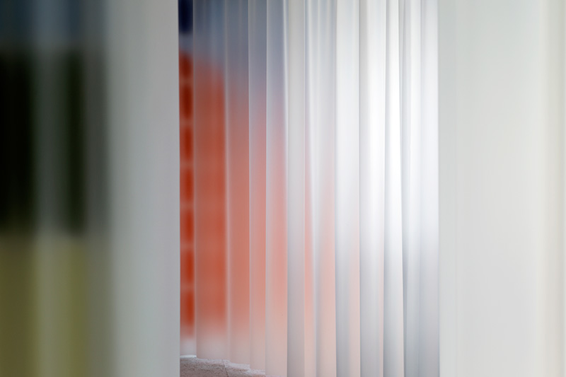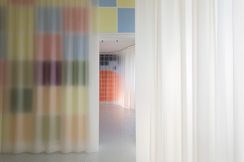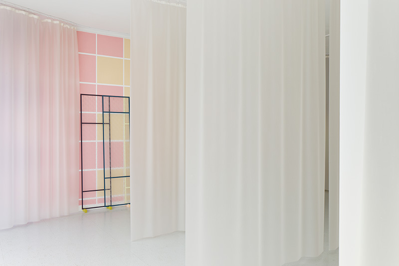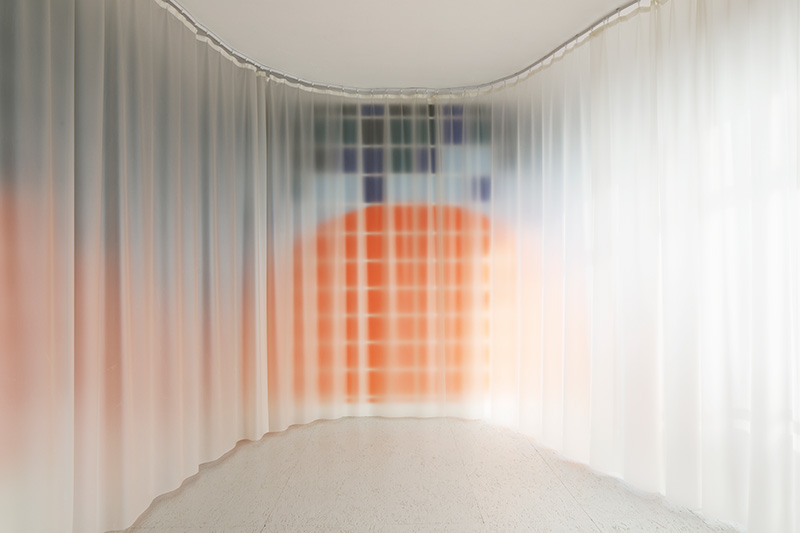 On peut lire, sur le site de bricolage monartisanat.fr : « La bâche et le tissu technique peuvent être indispensables aussi bien pour les particuliers que pour les professionnels. Appréciés pour leur résistance, leur souplesse et leur esthétique, ils sont utilisés en guise de protection, d’aménagement intérieur et extérieur, de couverture de façade, d’isolation phonique ou encore de brise-vue ». Le terme « brise-vue » est excellent. Comme les brise-lames protègent le port de la houle du large, la bâche empêcherait un regard un peu trop direct ou insistant sur les choses. La bâche est donc un rempart où vient s’échouer notre acuité visuelle. Disposée en vagues dans l’espace d’exposition, elle joue le rôle d’un prisme, en ce qu’elle démultiplie la perception des formes colorées. L’incertain fait trembler le précis, soulève le simple et le délicat comme l’aller-retour anadyomène d’une vague, une respiration douce ou le mouvement de diastole et de systole du cœur. Il y a une sensation de corps flottants et une perte de la vision centrale au profit de la vision périphérique : on ne voit que par les côtés. En parlant des œuvres d’Audrey Perzo, j’ai le sentiment d’être une ophtalmologue qui décrit les divers symptômes d’une diminution progressive de la vue.