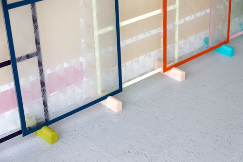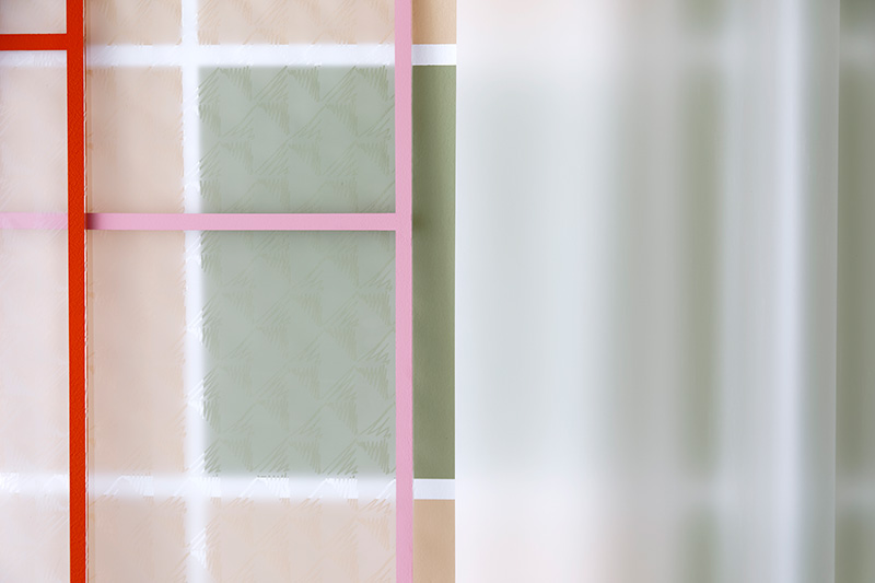 La peinture d’Audrey Perzo procède de l’architecture, du design, et de l’espace en général. Les lignes qui la traversent témoignent d’une géométrie appliquée, faite de pavements, de plans, de lignes de fuite, de volumes, de cercles et de carrés. La peinture est en cela « medium » au sens strict, c’est-à-dire qu’elle est un moyen d’accueillir et de transmettre autre chose qu’une forme ou une couleur définies, comme un conduit accompagnant des énergies potentielles. Aussi, se constate une poétique du bricolage où le brouillon, la maquette, le schéma et la cartographie sont moins marqueurs de repentirs et de travaux préparatoires que du travail en soi. Mais ces formes nettes sont rendues floues par le biais de plusieurs truchements : reflets, transparences, dispositifs membranaires. Leur précision première fait place à l’instabilité, au vaporeux, au tremblement. Par exemple, elles s’animent à travers un verre dépoli noyant les contours comme des fumerolles de pensées ou de silhouettes à la dérive. Ce sont dès lors des caractéristiques temporelles qui s’immiscent dans l’espace plastique puisque les formes sont poreuses aux éléments changeants qui les entourent : le mouvement, la lumière, l’environnement, les corps. Ce travail est donc un travail sur l’atmosphère et s’ouvre vers le spectateur qu’il place en son sein comme au milieu d’un paysage. Voyons-nous parce que nous voulons voir ou parce que quelque chose, au coin de l’œil, semble nous regarder ?