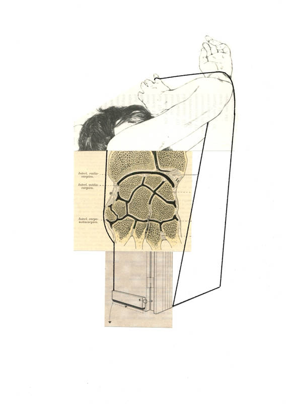 Dans son texte Drawing as Discovery [1], John Berger écrit : « C’est l’acte même de dessiner qui oblige l’artiste à regarder l’objet devant lui, à le disséquer dans l’œil de son esprit, puis à le reconstituer. » Cette idée de dissection est centrale dans mon travail de dessin et de collage. Je coupe, j’édite, j’assemble et je trace des lignes afin de produire un nouvel ensemble. Ce processus me permet d’établir des connexions formelles et linéaires entre des sources multiples, donnant lieu à une nouvelle proposition graphique.