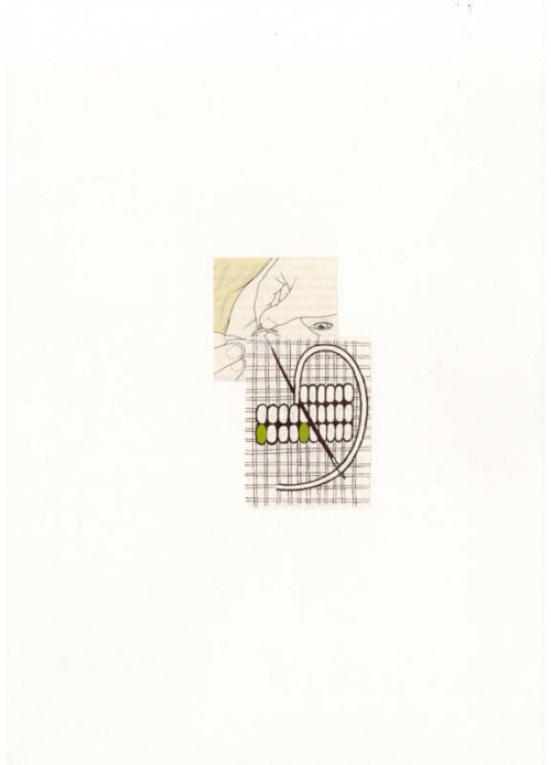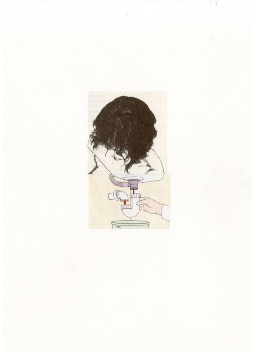 Effectivement, tes montages opèrent des télescopages, d’autant qu’ils sont faits d’images procédant d’univers et de styles différents : catalogue de plomberie vs planche anatomique, dessin technique vs dessin artistique... Au-delà de la surprise, tu joues souvent avec l’humour noir, cher aux surréalistes...