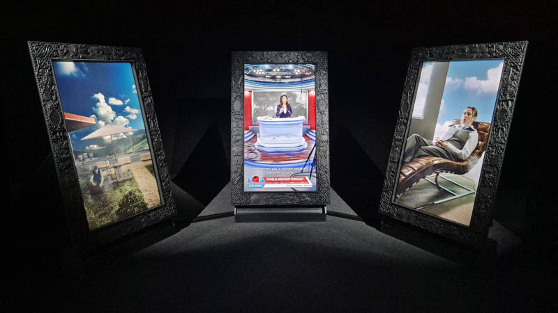 Dans la salle principale du rez-de-chaussée où les œuvres dialoguent entres elles, le triptyque vidéo I Could Live Here Forever d’Harold Lechien est composé de cadres noirs sculptés d’ornements qui renforcent la présence des trois séquences représentant autant de situations qui, parfois, se recoupent. Le sujet de cette pièce produite au Studio national des arts contemporains Le Fresnoy de Tourcoing, c’est l’évolution des métiers de l’audiovisuel. Celle notamment due aux mutations des techniques allant du tournage sur fond vert à l’usage de l’intelligence artificielle générative, en passant par celles qui autorisent la diffusion de contenus en ligne au plus grand nombre. De ce fait, les performances de plus en plus contraintes de celles et ceux qui travaillent à l’écran ont tendance à passer au second plan, alors que la démocratisation des techniques fragilise les économies qui leur sont associées.