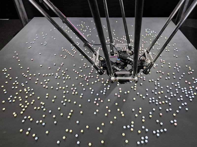 Le remplacement progressif des humains par les machines est magnifiquement incarné par l’installation robotisée Perpétuité Il conçue et réalisée par Félix Luque Sánchez en collaboration avec Iñigo Bilbao Lopategui, Damien Gernay et Vincent Evrard. Le robot industriel, qui sans cesse réarrange à plat un assemblage de pilules diversement colorées, est au centre de toutes les attentions. Son action sans début ni fin convoque le pointillisme en art, bien que ce soit le process qui, ici, fasse œuvre plutôt que le résultat. Comme si la machine était « incapable » de se satisfaire de la représentation d’un instant t. A moins qu’elle ne soit perfectionniste, à l’instar des artistes qui, jamais, n’achèveront leurs œuvres en les privant ainsi de tout espoir de public.