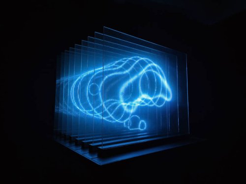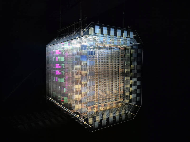 La multiplication de ces bruits d’eau nous apaise en ces temps difficiles. Lucien Bitaux, à l’inverse, revendique la complexité de sa sculpture intitulée Micro-Strates. Elle représente l’agrandissement par couches d’un objet technique. Le composant électronique dont il est question, c’est le capteur « Ultra HDR » développé par le laboratoire ICube de l’Université de Strasbourg. Nous sommes entourés, dans nos vies quotidiennes, de tels senseurs, jusque dans nos poches, sans jamais en considérer l’extrême miniaturisation qui nous les rend totalement imperceptibles. L’installation de l’artiste, qui s’inscrit dans la continuité des pratiques mêlant les arts aux sciences, attire ainsi notre attention sur cette dimension où règnent en maître les microprocesseurs. Ces derniers régissent de plus en plus nos vies, même pour des actions anodines comme déverrouiller des applications sécurisées.