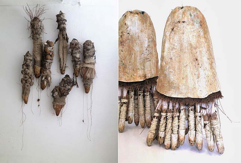 Nous sommes au cœur des sculptures et des livres d’Adeline Contreras. Elle pense au livre de l’insecte et à la tanière de la fouine, ses matériaux construisent ensemble des symphonies de chaud et de froid, des surfaces auxquelles répondent racines et crins.
