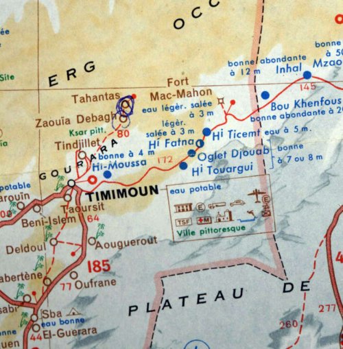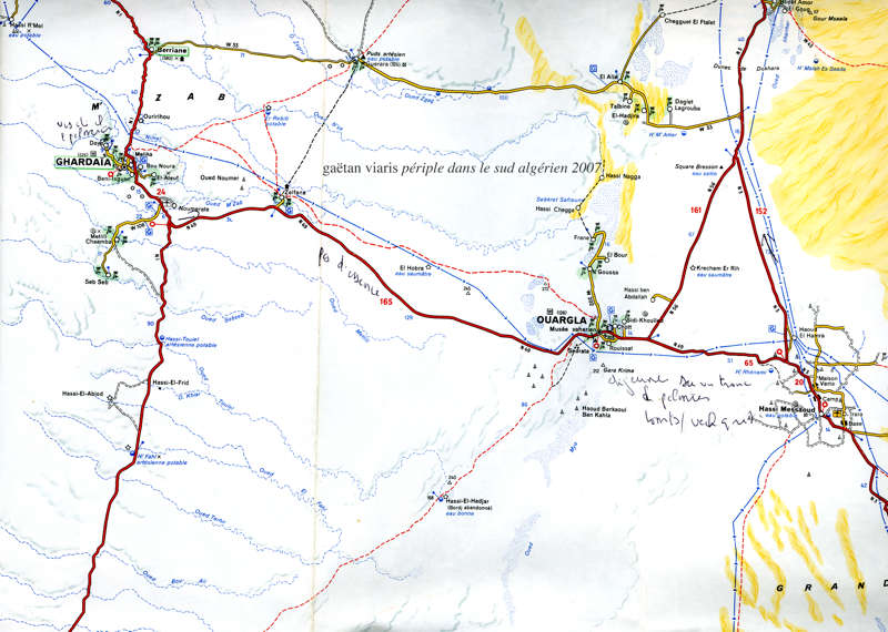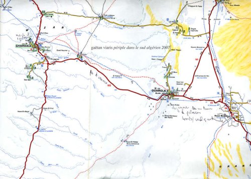 Puis de Djanet, le Ville Evrard vire plein nord-ouest full Nothwest bound en direction de El Golea et Timimoun (route que j’avais empruntée en 2007 qui traverse de nombreux champs de pétrole). Cependant faire très attention, : malgré cette proximité de champs pétrolifères, on ne trouve aucun poste d’essence entre Ouargla et Ghardaïa.