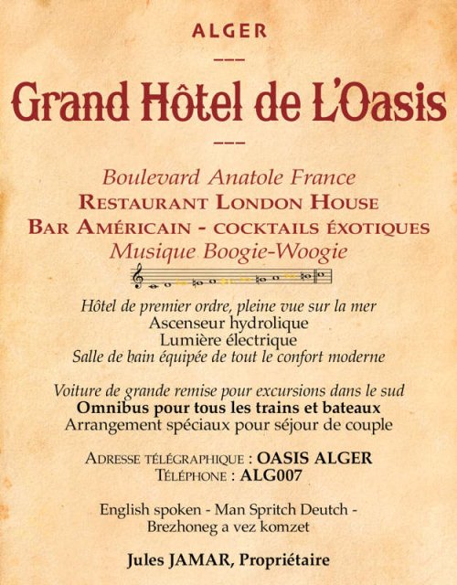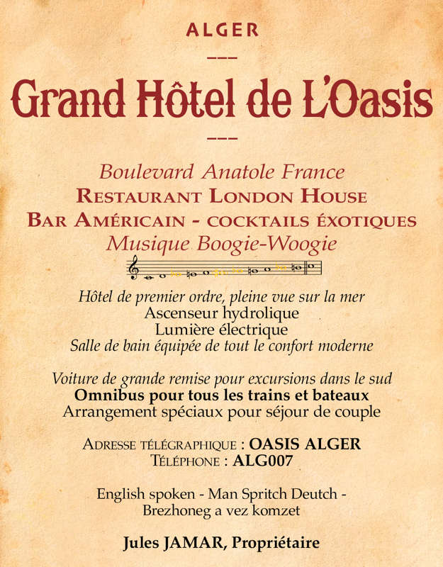 Après cet intermède sur la Casbah, revenons à notre survol d’Alger. Je devine la localisation de l’hôtel de l’Oasis où je descendais quelquefois pour être au centre de la ville et dont je vous montre l’affiche publicitaire en modern style.
