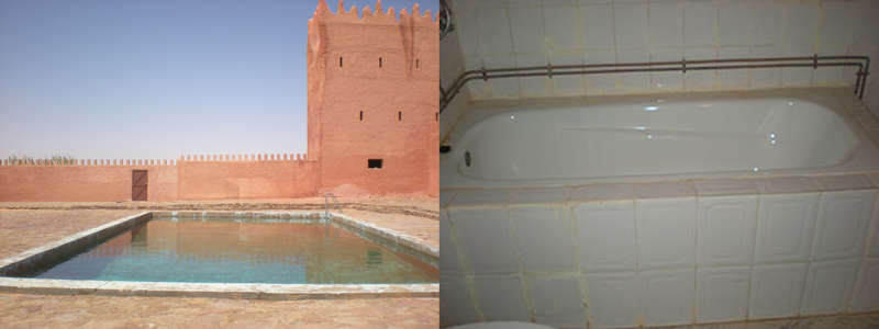 Et, en effet, après un court séjour dans la ville, logé chez un notable, et sur sa recommandation, je visite le circuit de Tinerkouk et son fort construit par les Français durant la guerre d’Algérie et restauré récemment avec talent. Je vous montre ici sa grande piscine dans laquelle j’ai pu me baigner sur invitation du jeune conservateur très chaleureux. Je ne peux m’empêcher aussi de vous faire découvrir la salle de bains privée du commandant du fort, restaurée à l’identique.