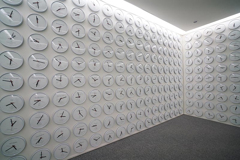 For Proper Time (2017), Lee produced over 600 clocks with names, birthdates, and nationalities of individuals that Lee interviewed. Each clock moves at a different speed based on the interviewee’s working hours in order to afford a meal. Fast moving clocks mean that the individuals are rich. The slower clocks represent individuals with lower income. Global capitalism lets individuals’ psychological time run in different rates.