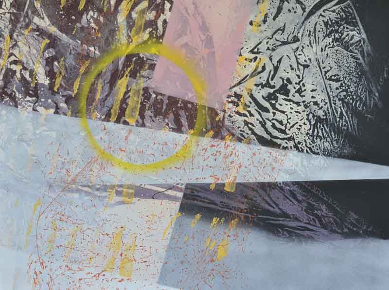 Clairs-allants, c’est la belle formulation de l’artiste pour désigner l’ensemble des peintures qu’elle réalise depuis plus de vingt ans. Le terme est porteur de ce qui la fascine dans la peinture : la couleur qui génère la lumière, et les formes, produites par des gestes, qui créent la sensation de mouvement. Le désir d’explorer la couleur en tant que lumière, transparence et mouvement est né bien en amont des premiers Clairs-allants. Dans les années 1980, en contemplant l’architecture du Centre Pompidou et en particulier son escalator vitré, le déplacement perpétuel des personnes qui montaient et descendaient tout en étant traversées de couleurs et de reflets, lui a provoqué une sorte de révélation visuelle : « Je crois, dit-elle, que c’est là l’origine de mon intérêt pour la transparence et la superposition de plans [1] ». S’ensuivent alors plusieurs années d’expérimentations : l’artiste dessine, fabrique des sculptures, peint sur des supports transparents.