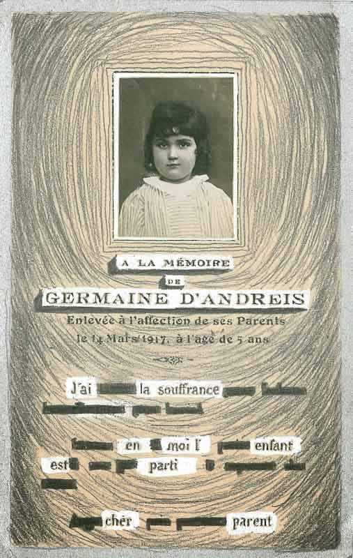 Dans une autre série de dessins, « Ange chéri », Alexandre Leger explore une histoire de filiation et la persistance du lien dans le temps. Exécutées sur des faire-part du décès de sa grand-tante, morte à l’âge de 5 ans en 1917, ces œuvres intègrent la photographie de la petite fille et des fragments du texte du faire-part dans la matière dessinée, richement travaillée au crayon, au stylo et à l’aquarelle. Elles honorent à la fois la mémoire de l’enfant décédée et celle de sa sœur, la grand-mère de l’artiste, qui était peintre et fresquiste. Dans l’un des dessins, la photographie de l’enfant est entourée d’un cadre composé d’une multitude de petits carreaux colorés, faisant appel aux mosaïques de sa sœur. Avec « Ange chéri », Alexandre Leger s’inscrit dans une lignée d’artistes. Il reconnaît son héritage artistique tout en affirmant son langage plastique personnel. Par le biais du graphisme et de la recherche du sens poétique, il construit une autre histoire, la sienne, en tant que poète-dessinateur.
