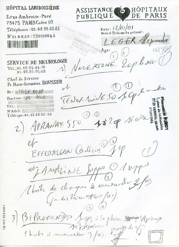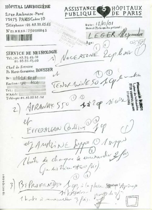 Les choix plastiques et poétiques d’Alexandre Leger sont intimement liés à son histoire personnelle. Fils de médecin, lui-même étudiant en médecine avant d’intégrer l’École des Beaux-Arts de Paris, et petit-fils d’artistes, il puise dans son héritage à la fois scientifique et artistique pour bâtir son œuvre. Les dessins d’ordonnances médicales, qui nous évoquent la maladie et la vulnérabilité de nos corps, se réfèrent à la voie non-choisie par l’artiste. Ils révèlent également son intérêt pour le lien entre le texte et l’image. Les écritures manuscrites et imprimées de l’ordonnance originale — l’en-tête de l’hôpital, l’écriture parfois indéchiffrable du médecin, les chiffres, un code barre, un tampon de pharmacie — sont redessinées à la main levée. Fascinants par leur mélange texturé de mots et de traits, les « Ordonnances » sont des images à regarder et à lire, ouvrant la voie vers les Dessins-Poèmes.
