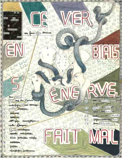 Dans une œuvre récente, le regard est saisi par des mots dessinés en grandes lettres bâtons au crayon à papier et au crayon de couleur rouge : CE VER, EN BIAIS, S’ÉNERVE, FAIT MAL. Ils rythment l’espace pictural comme un avertissement au spectateur, tout en s’articulant autour d’un croquis de bassin qui occupe le milieu de la feuille. Les différentes parties du bassin sont numérotées, les chiffres correspondant à une légende qui accompagne le dessin. Esquissé peut-être par un étudiant en kinésithérapie, ce croquis anatomique, vestige du sérieux de l’étudiant et de son désir de connaissance, est détourné par l’artiste pour faire surgir des méditations à la fois sombres et insolites. Alexandre Leger a rajouté au croquis « ce ver, en biais » qui descend du haut de la feuille, tubulaire et sinueux ; le ver serpente autour du bassin, entre et sort des orifices, et ligote les os entre eux. Dans la légende, l’artiste a également raturé plusieurs mots et en a entouré d’autres, les reliant entre eux par une ligne qui zigzague, à la recherche du sens qui résonne avec le poème.