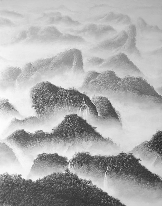 Attardons-nous sur Gaïa. Sur un registre monochrome se déploie une succession asymétrique de massifs montagneux. Ça et là, des torrents transpercent leurs drapés forestiers. L’alternance des sommets est rythmée d’intermèdes brumeux. La gradation chromatique, d’un noir sobre à l’aérien gris-blanc, s’obtient par l’application d’un pinceau sec. La montagne s’élève jusqu’aux cieux infinis empruntant ses hauteurs aux voluptés d’une femme allongée. De l’aveu du peintre, la déesse mère est une ode à sa terre natale : Cuba. Cartographie mentale d’une île que Rubén Fuentes quitte en 2007 pour s’établir en Europe, Gaïa est l’image-totem des Paysages Mentaux. Placée en ouverture de la série, elle enfante les images suivantes : pomo et autres hatsuboku confèrent à Rubén Fuentes structures et outils ; Cuba lui inspire ses sujets.